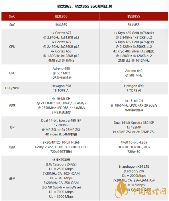 更為重大的升級(jí)之一應(yīng)該是支持LPDDR5內(nèi)存。驍龍865處理器集成了新的LPDDR5和LPDDR4X內(nèi)存控制器,LPDDR5內(nèi)存能夠帶來更高的內(nèi)存速度以及更高的帶寬,以及功耗也會(huì)得到相應(yīng)的提升。但是新的內(nèi)存的延遲應(yīng)該是一樣的。驍龍865處理器以及驍龍855處理器的技術(shù)規(guī)格如下表: