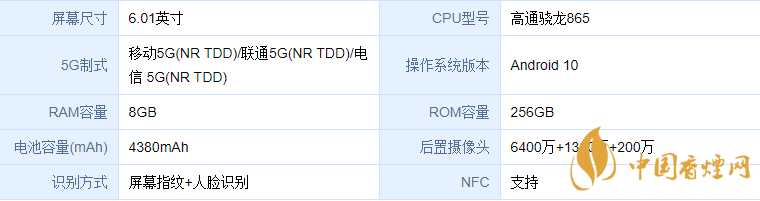 核心性能,搭載高通驍龍865處理器,內(nèi)存為8+256GB組合,支持SA/NSA雙模5G,支持Wi-Fi6。