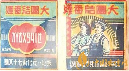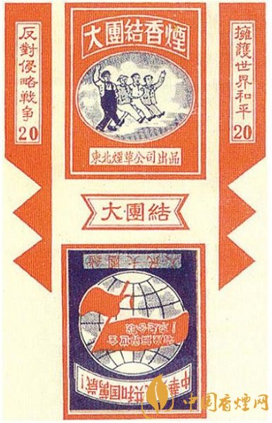 東北煙草公司出品的“大團(tuán)結(jié)”煙標(biāo),主版圖案為4個(gè)男性人物攜手并進(jìn)的場(chǎng)景,側(cè)標(biāo)位置分別印有“擁護(hù)世界和平”“反對(duì)侵略戰(zhàn)爭(zhēng)”字樣,副版圖案為地球上飄揚(yáng)著一面上書(shū)“全世界無(wú)產(chǎn)者聯(lián)合起來(lái)”字樣的旗幟,在其上下則分別印有“中華人民共和國(guó)萬(wàn)歲”“人民大團(tuán)結(jié)”字樣。