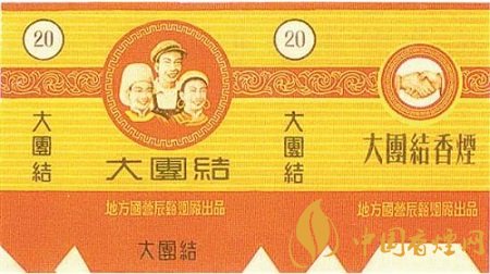 這一時(shí)期出品的“大團(tuán)結(jié)”煙標(biāo)也有很多,如太原煙草廠(chǎng)出品的“大團(tuán)結(jié)”煙標(biāo),主版于花卉圓圖內(nèi)印有“大團(tuán)結(jié)”字樣;地方國(guó)營(yíng)辰谿煙廠(chǎng)出品的“大團(tuán)結(jié)”煙標(biāo),主版圖案為兩名女性和一名男性的人物形象,副版是兩只手緊緊握在一起的畫(huà)面。