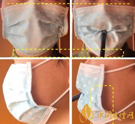 從正面看,因?yàn)樽觳亢?ldquo;香煙”的緣故,原本被金屬條緊貼鼻梁的口罩上沿滑下,使得鼻梁兩側(cè)出現(xiàn)明顯空隙;而口罩下沿也因此收窄,出現(xiàn)“通風(fēng)口”。從側(cè)面看,嘴含住“香煙“的同時(shí),部分口罩也被塞入嘴中,口罩兩側(cè)受到向中間拉扯的力量,不再貼合臉頰。