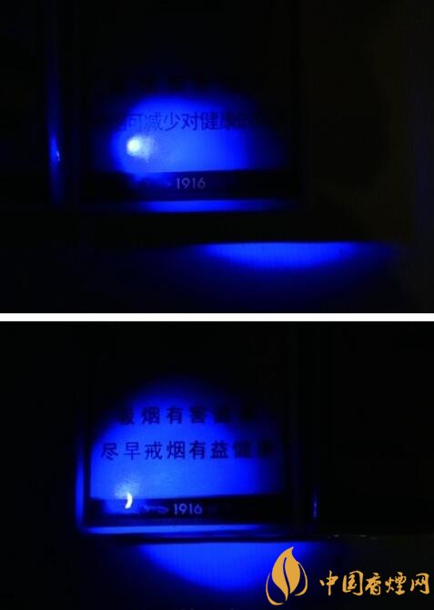 真品小盒正反面“1916”字樣均采用DNA防偽涂層油墨,用紫外熒光燈照射“1916”字樣時(shí),字體由白色變色,“HUANGHELOU”燙金油墨厚且顏色呈現(xiàn)深黃色;假煙仿制材料無法達(dá)到真品材料特殊效果,在同樣的紫外熒光燈照射下沒有任何變化,“HUANGHELOU”仿印油墨涂層較薄,呈現(xiàn)出淺黃色,與真品材質(zhì)存在顯著差異。