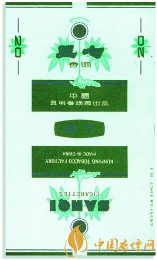 1983年昆明卷煙廠出品。主、副圖為綠色三七植株,商標簡捷、具像,主題醒目。三七為云南省著名且地道的中藥材特產(chǎn),盛產(chǎn)于滇東文山州地區(qū),其歷史悠久、產(chǎn)量大、質量好,習稱“文三七”、“田七”。