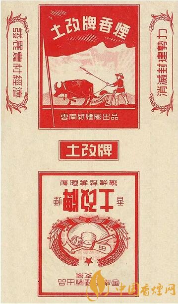 1951~1952年云南紙煙廠出品。主圖為農民駕耕牛犁田,副圖為草帽鋤頭麥穗圍成紅色圖案,“發(fā)展農村經(jīng)濟、消滅封建勢力”字樣,表現(xiàn)農民第一次成為土地的主人,在田間精心勞作形象。1950年云南和平解放,1951年開展大規(guī)模的土地改革運動。該煙標是中國煙標史上少見的“土改”牌煙標。