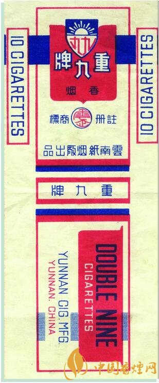 1945年,云南紙煙廠出品。創(chuàng)牌于1922年,為紀念護國名將蔡鍔等所領導的“重九起義”而創(chuàng)牌,重九牌歷史悠久,具有豐富的文化內涵,是云南紙煙廠的榮譽產(chǎn)品。該牌號卷煙僅生產(chǎn)13.85箱,屬罕見珍貴煙標,具有歷史文物價值。1945年6月1日云南紙煙廠在昆明金碧日報刊登“重九”牌更換商標紙盒啟示 , 以此啟示為證改寫了此枚珍貴歷史商標的確切生產(chǎn)時間。
