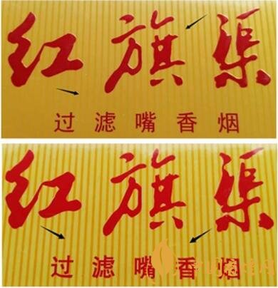該款假冒卷煙“紅旗渠”字體未做“起凸”處理,字體平整,無(wú)立體感。(圖1上真下假)