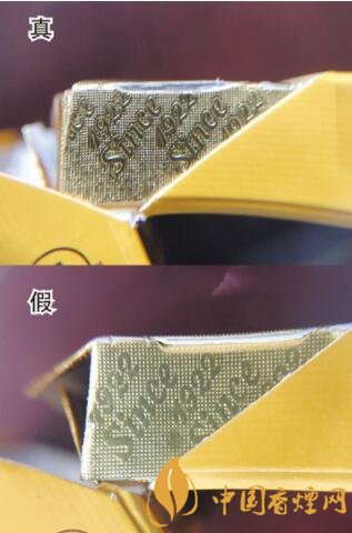 真煙側(cè)面印刷字體“since1922”字跡清晰,凹凸明顯;假煙字跡模糊,無明顯凹凸。
