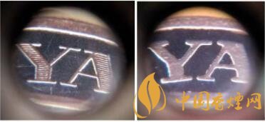 4.YUNYAN拼音字母。真品卷煙金腰帶頂部YUNYAN拼音,筆畫內(nèi)有橫線條痕跡。該款假冒卷煙字母筆畫內(nèi)無橫線條痕跡。圖4左真右假