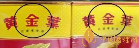 2、正面翻蓋處“黃金葉”文字:真煙“黃金葉”三字立體感強(qiáng),用手觸摸有凹凸感。假煙字體無(wú)立體感,手摸無(wú)凹凸觸感。(左真右假)