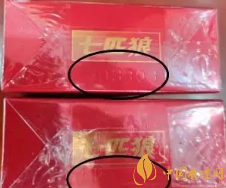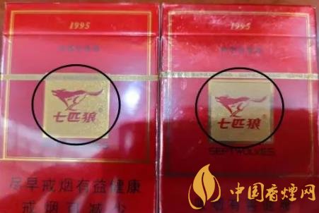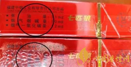 1、商標(biāo)紙上的“七匹狼”商標(biāo)圖案:真煙套印準(zhǔn)確,燙金飽滿(mǎn),色澤鮮亮,圖案生動(dòng),立體感強(qiáng)。假煙燙金套印容易出現(xiàn)錯(cuò)位,燙金處會(huì)出現(xiàn)漏金現(xiàn)象,顏色相較真煙暗沉,立體感差。(左真右假)