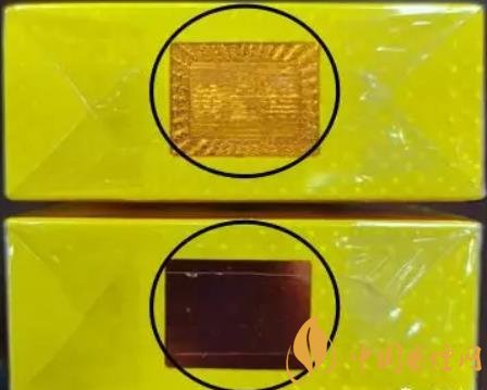 3、煙盒頂部防偽標(biāo)識(shí):真煙在不同角度可見(jiàn)黃金葉文字與圖案相互變換。假煙未能顯現(xiàn)真煙防偽標(biāo)識(shí)的效果,或者文字與圖案層疊無(wú)法清晰分離。(上真下假)