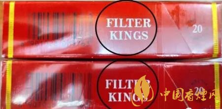 2、側(cè)面英文“FILTER KINGS”:用紫外燈照射真煙“FILTER KINGS”后,移開(kāi)紫外燈,照射處字體會(huì)由黑色逐漸褪色。假煙無(wú)此效果,或變色效果差。(上真下假)