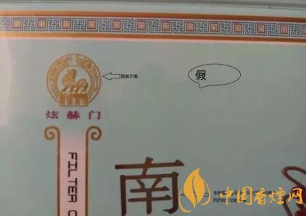 看條盒顏色,真煙為淡藍色,顏色柔和純正;假煙為淺藍色,視覺上顏色不是自然色。看條盒圖標,真煙“南京”二字字體端正清晰,龍須印刷圖案無重疊,龍身金線為凸版,條盒金邊無毛刺;假煙“南京”二字字體向左微傾,龍須有疊痕錯層,龍身顏色為褐紅色、金線為凹版,條盒金邊有毛刺。