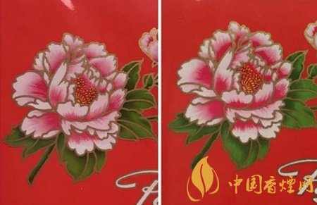 真品卷煙商標紙上的牡丹花瓣的粉紅色采用漸變技術,顏色由深逐漸到淺,自然協(xié)調,立體感強;假煙采用普通仿制技術,粉紅色部分集中于一角,顏色搭配較為死板,立體感差。