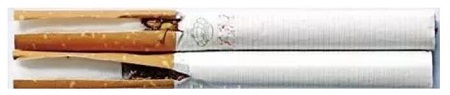 真煙煙支采用單一醋纖濾嘴,長(zhǎng)度為25mm;假煙煙支過(guò)濾嘴較短,長(zhǎng)度約為21mm,與真品特征存在明顯差異。(上真下假)