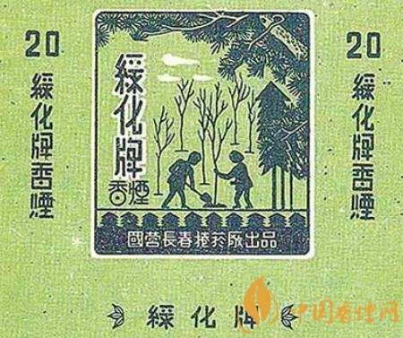 上世紀50年代,國營長春卷煙廠出品了“綠化牌”煙標。這枚煙標以綠色為底色,主版采用剪影的形式描繪了一幅植樹圖,畫面上一個人扶著樹苗,另外一個人揮鍬培土,不遠處是已經(jīng)栽種好的一棵棵樹苗,在樹苗右上方,高大濃密的松樹如母親一般呵護著小樹苗;副版上印著“大家植樹 綠化祖國 護林防火 人人有責”的字樣。