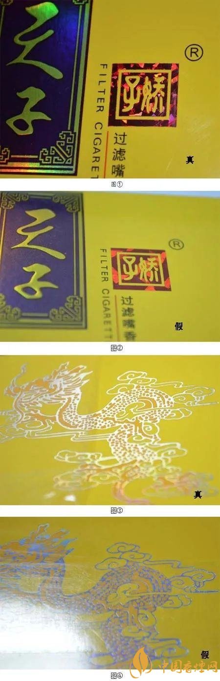 “天子”兩字。真煙顏色純正,清晰無雜質(zhì);假煙則常有粘連、雜質(zhì),顏色漸變褪色。