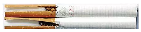 真煙煙支采用單一醋纖濾嘴,長度為25mm;假煙煙支過濾嘴較短,長度約為21mm,與真品特征存在明顯差異。