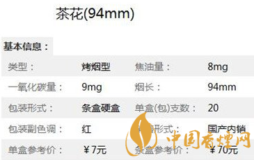 在了解了細(xì)支白盒茶花煙多少錢一包 之后,為了大家能更詳見的了解此煙,小編特意將茶花(94mm)香煙的核心參數(shù)進(jìn)行了整理,以便于對(duì)它進(jìn)行更深入的了解。