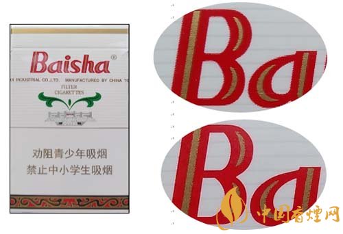 假冒卷煙:背面Baisha拼音字母膠印,紅色與白色交界位置無鋸齒痕跡。