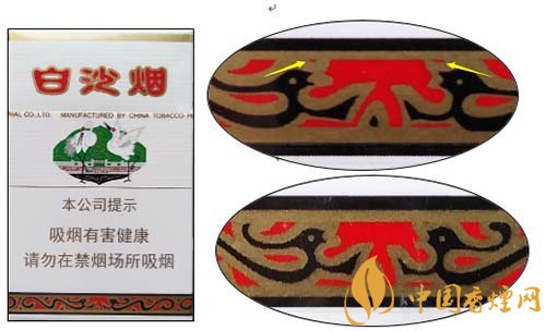白沙(硬)因江南名泉式 ---“白沙古井”而得名,包裝以“白沙古井” 為背景,象征吉祥如意的雙鶴圖形為主體圖案。產(chǎn)品不斷應用新技術,科學配方,合理配香配料,口味特點:煙香濃馥、諧調,余味純正舒適?,F(xiàn)就該卷煙小盒鑒別方法介紹如下: