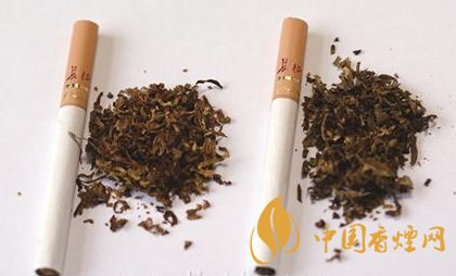 煙支過(guò)濾嘴及煙絲差異對(duì)比:真煙煙支采用單一醋纖濾嘴,長(zhǎng)度為25mm,煙絲切絲寬度均勻,煙絲疏松、光澤油潤(rùn)性好、呈檸檬黃色、含碎末少,煙絲結(jié)構(gòu)為葉絲、膨脹葉絲、膨脹梗絲和再造煙葉;假煙煙支過(guò)濾嘴較短,長(zhǎng)度約為20mm,制絲工藝粗糙,色澤發(fā)暗無(wú)光澤、呈青褐色、煙絲中含碎末較多,大量梗絲未經(jīng)過(guò)膨脹處理,一般無(wú)膨脹葉絲和再造煙葉,與真品特征存在明顯差異。