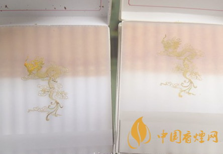 小盒商標(biāo)印刷工藝差異對比:真品小盒正面套印定位燙金“飛龍”圖案鱗片清晰,從頭至尾都能看到定位燙金工藝,紅色貫穿整個(gè)龍身,“鱗片”是雪里透紅,栩栩如生;假煙套印定位燙金仿制較差,鱗片無法達(dá)到真品的印刷工藝水平,印刷工藝與真品商標(biāo)圖案差異明顯。