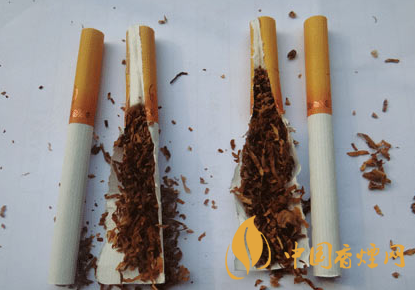 煙支及煙絲差異比對:真品煙支加長濾棒用來降焦減害,煙絲配比及切絲寬度均勻,假煙煙支濾棒只有19mm,無法達到減害降焦作用,煙絲含梗末較多,與真品煙絲外觀特征存在明顯差異。