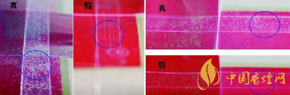 如圖所示:“蘇煙”的拉線采用特殊的工藝,真煙的拉線上面有很明顯的“麻點(diǎn)”,我們通常叫做“氣泡”;假煙的拉線上面沒有“氣泡”。