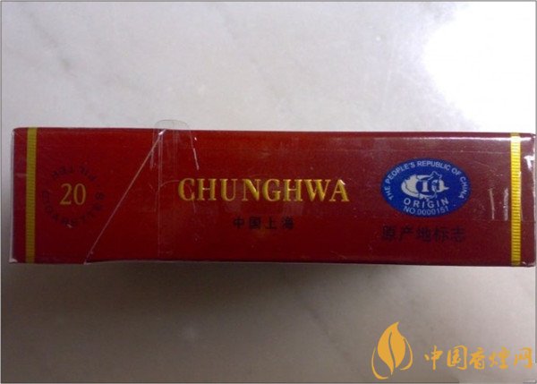 煙盒的左側(cè)標注著英文字母“CHUNG HWA”和藍色的防偽標簽。中華的出產(chǎn)方。